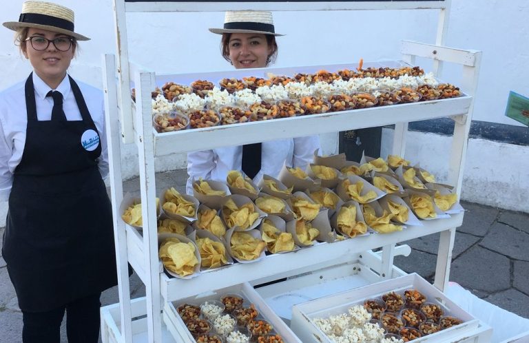 Ofrecer a sus invitados patatas fritas, frutos secos, palomitas, agua y cerveza en la puerta de la iglesia es una excelente manera de darles la bienvenida y hacer que se sientan cómodos.